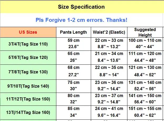Sizes: 110, 120, 130, 140, 150, 160Suit for 2-14 Years Kids (Only for reference)
