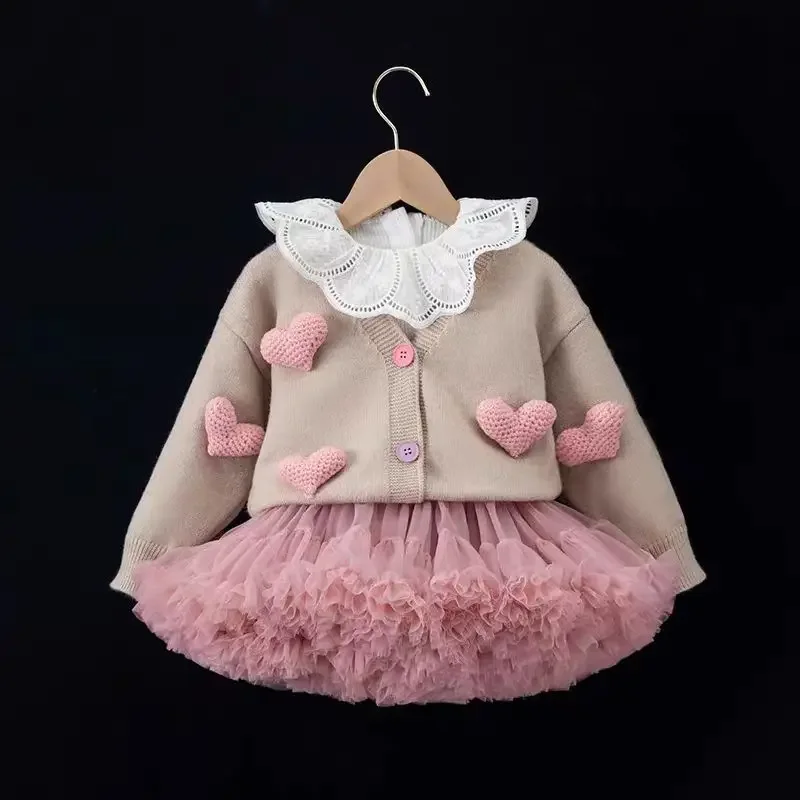 2024 Korean Kids Clothing Sweaters Autumn Tutu Coat Three-Dimensional Love Knitted Cardigan Girls Jacket Baby Girl Clothes 2-8Y