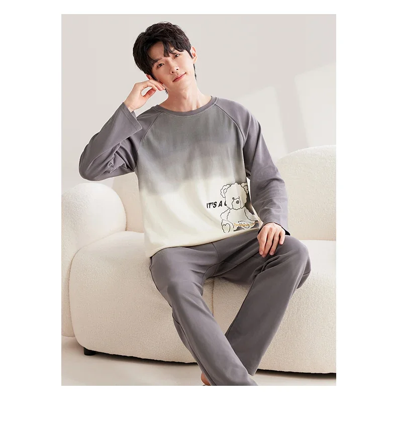 Autumn Spring Homesuit for Man New Mens Sleepwear Faux Cotton Pullover Long Sleeves Pajamas Set Cartoon Strip Loungewear for Boy