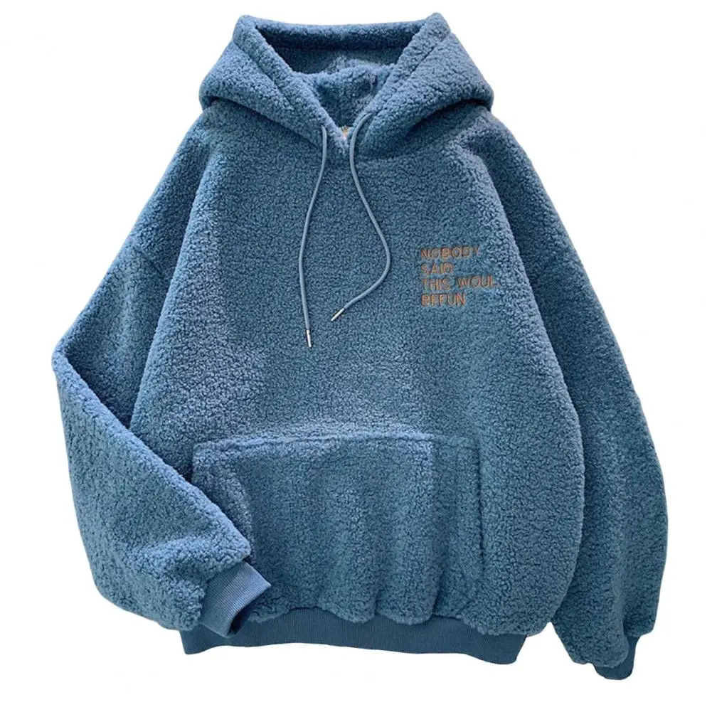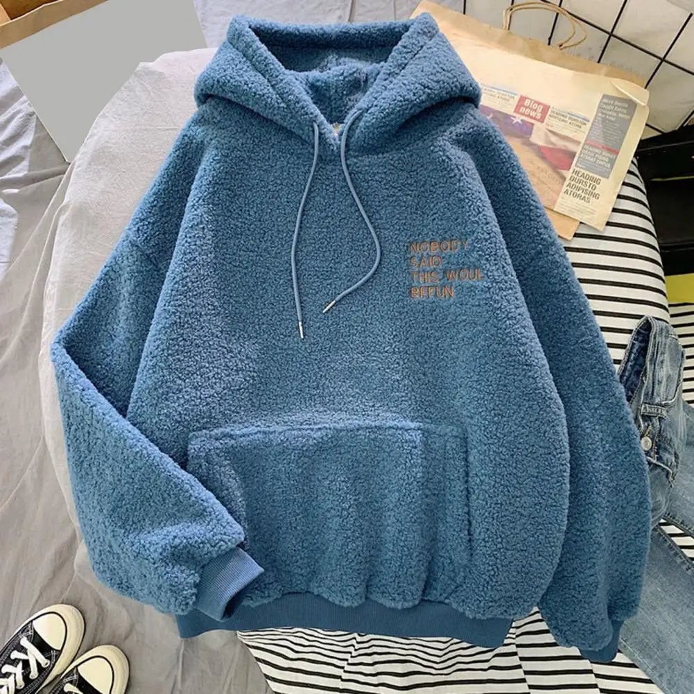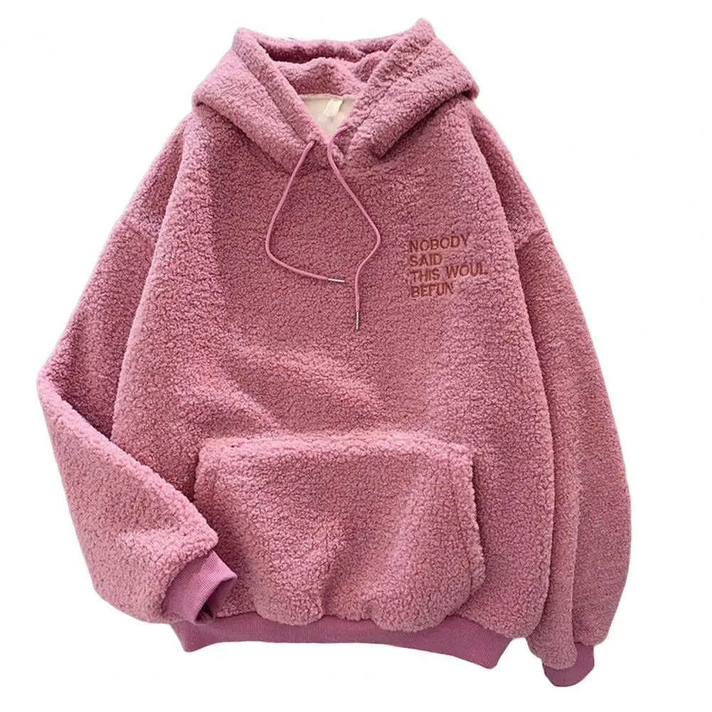 Fall Winter Women Hoodie Drawstring Elastic Cuff Thick Fleece Patch Pocket Loose Long Sleeves Pullover Warm Letter Embroidery Top