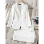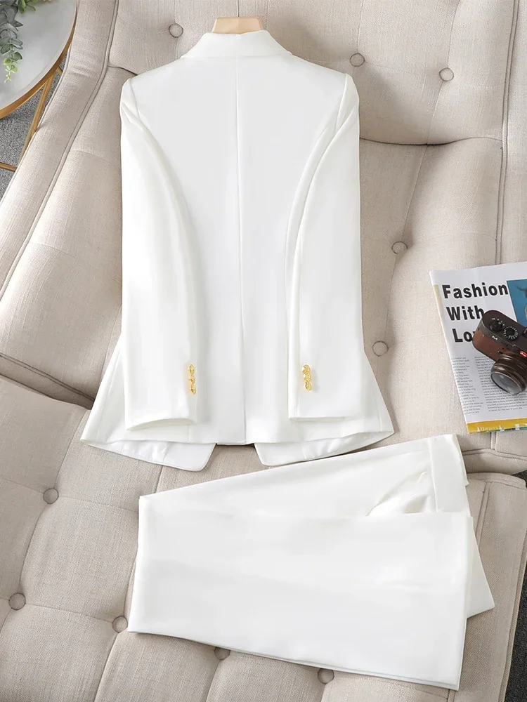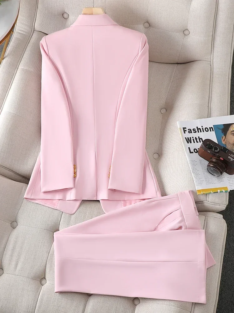 Button Decoration Formal Jacket Blazer and Trouser 2 Piece Set Fashion Pink Green Black Ladies Work Wear Pant Suit Women