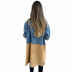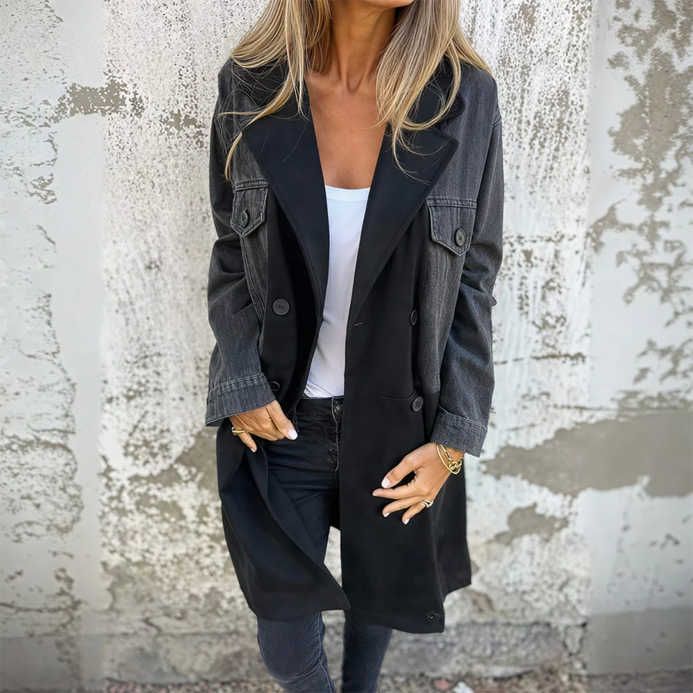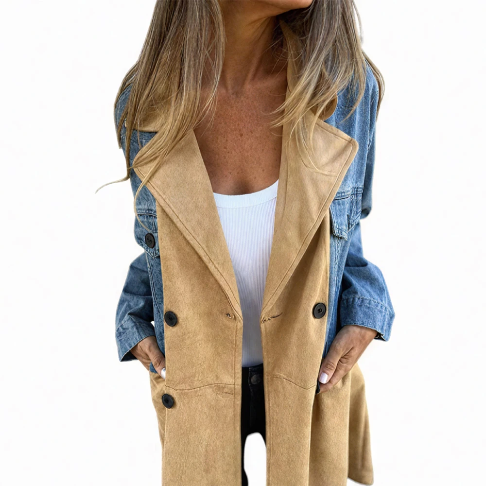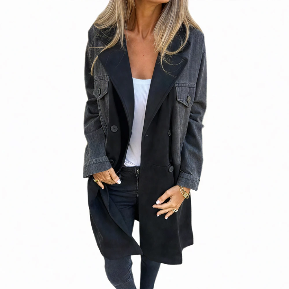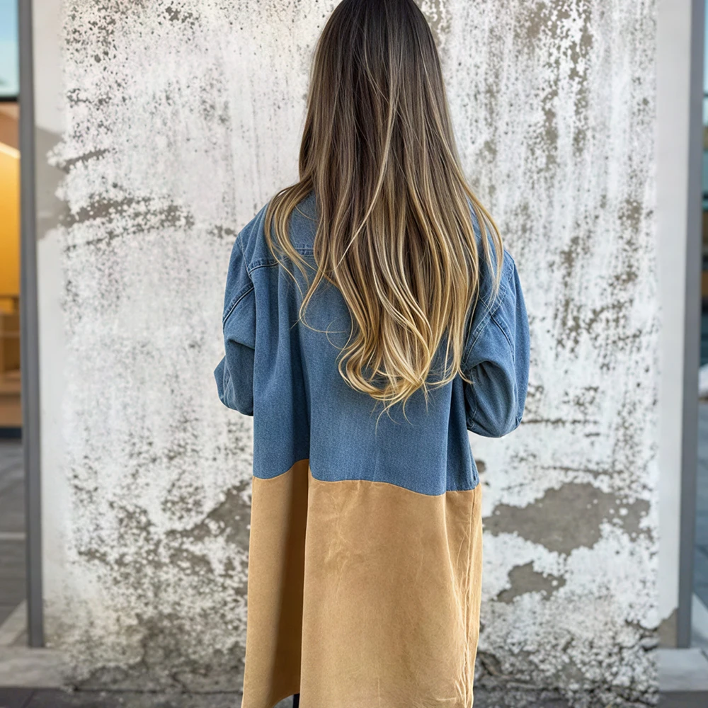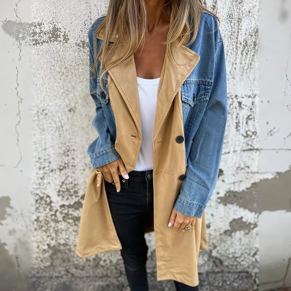 Casual Retro Denim Tops Middle Length Suit Collar Splicing Jacket Women Coat Suitable For Spring And Autumn