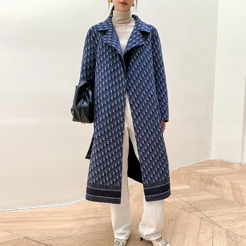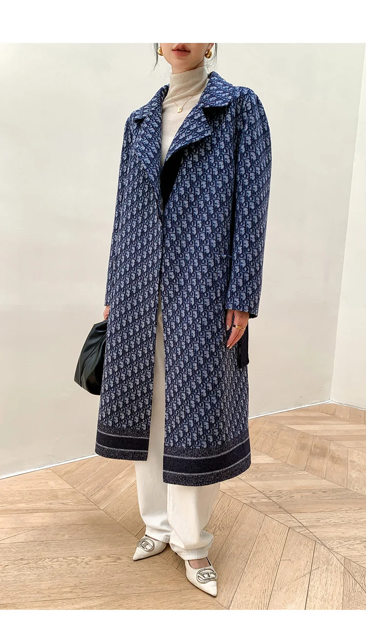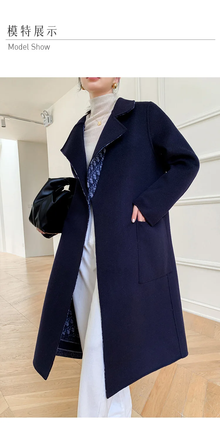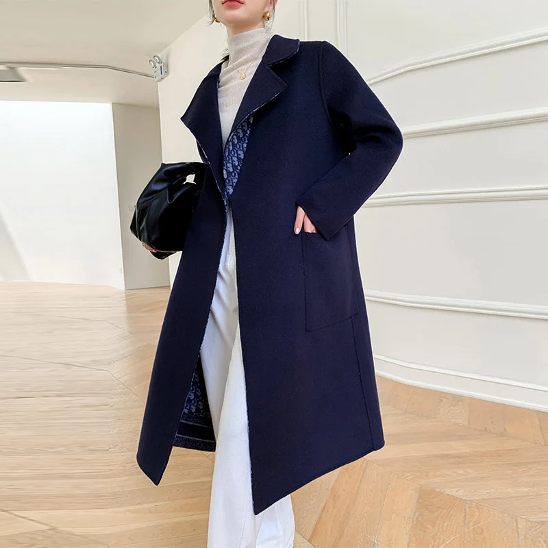 Double-Sided Wearable Autumn and Winter High-End Women’s 100%Wool Overcoat Long Wild Coat Fashionable Dark Blue Women’s Clothing