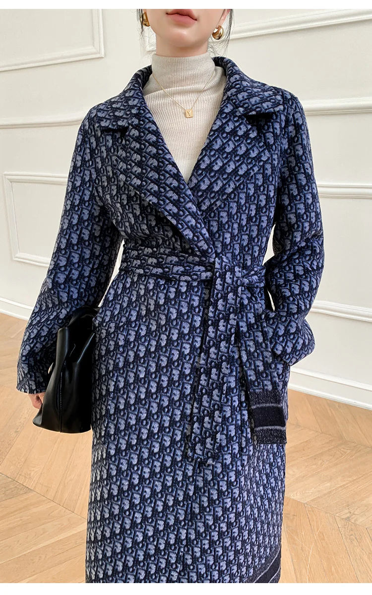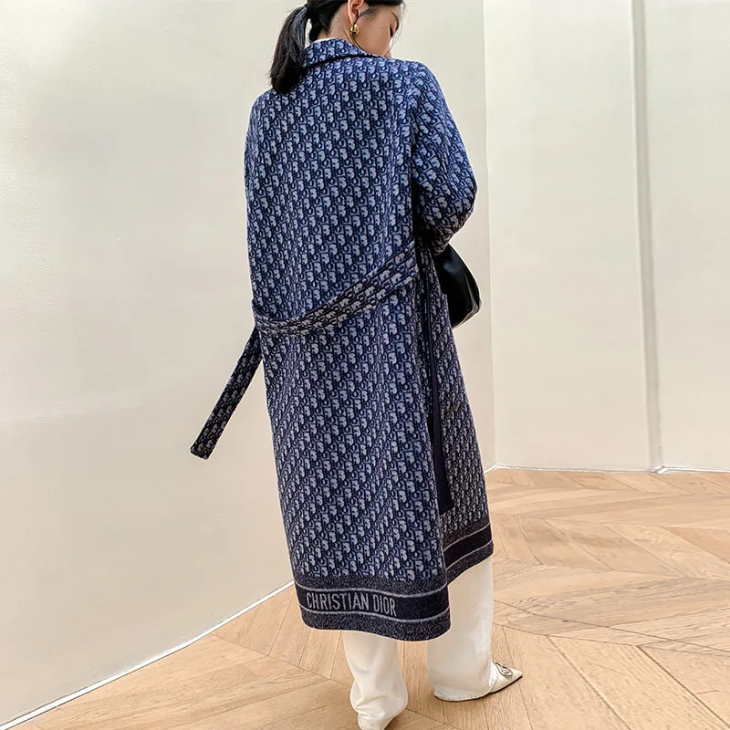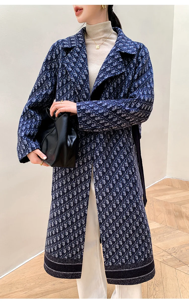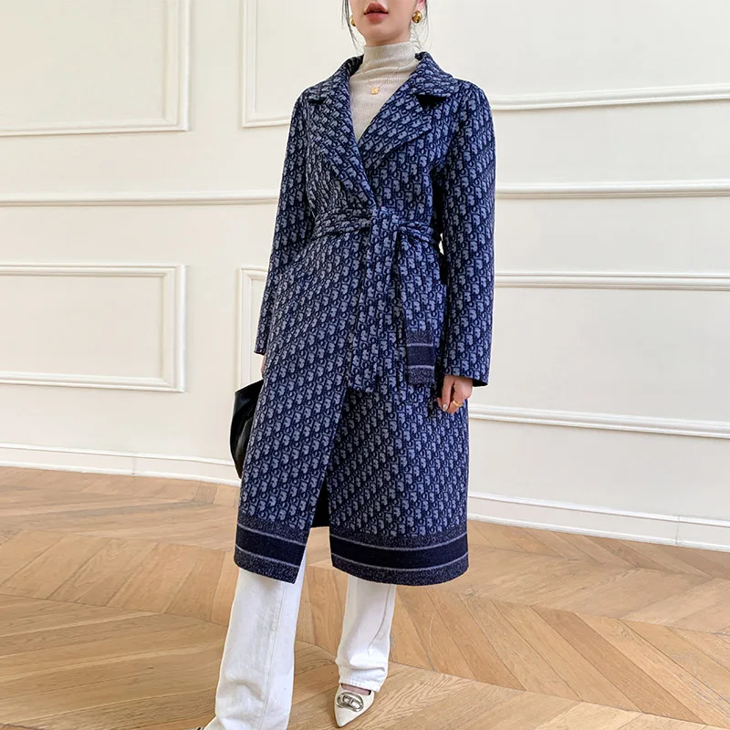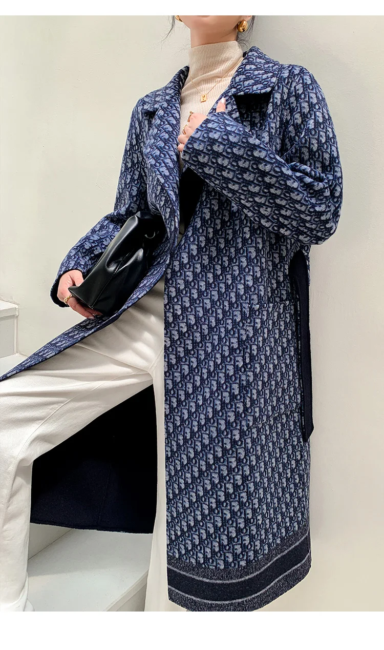 Double-Sided Wearable Autumn and Winter High-End Women’s 100%Wool Overcoat Long Wild Coat Fashionable Dark Blue Women’s Clothing