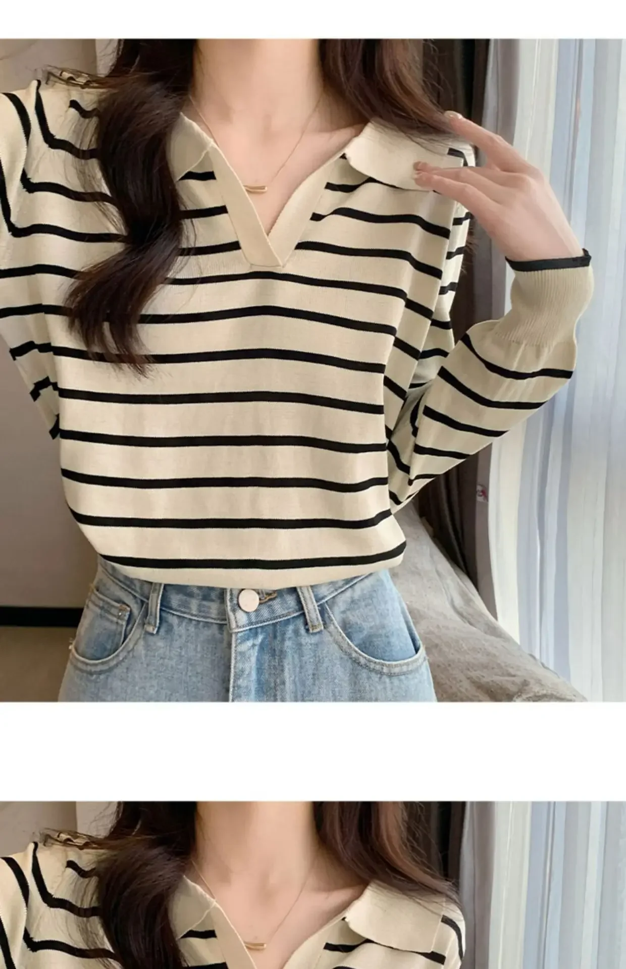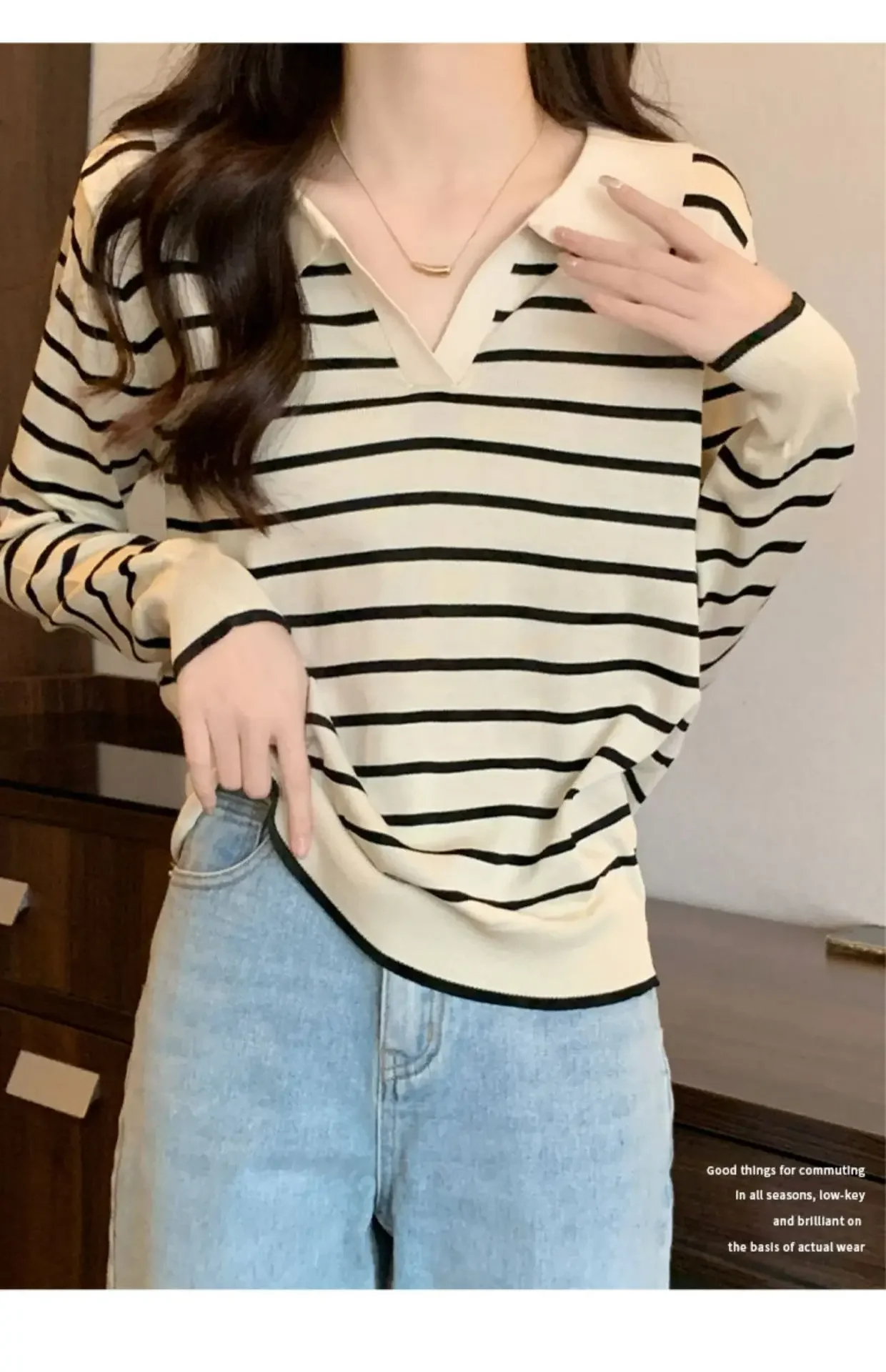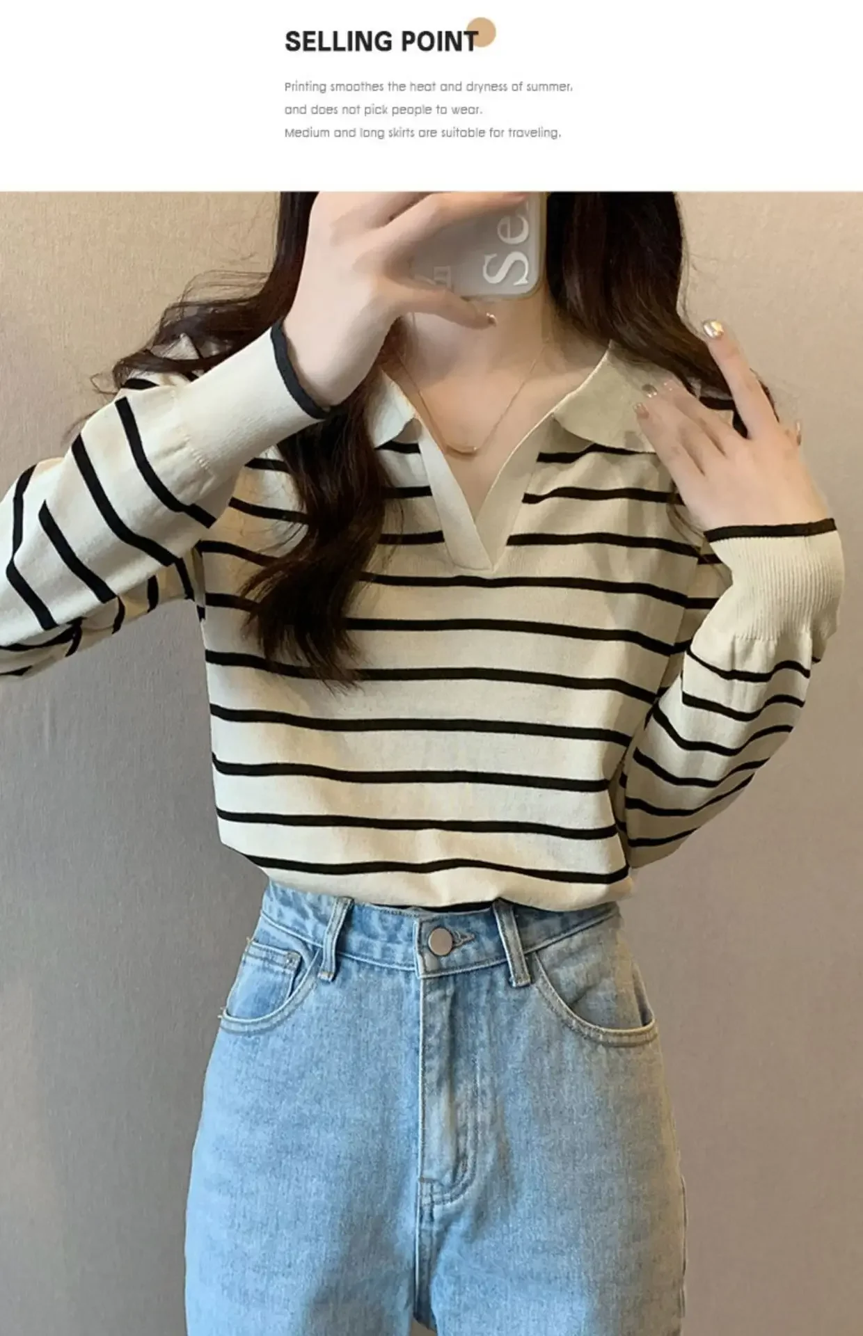 Fashion Striped T-shirt Casual Pullover Knitwear Women Spring and Autumn Underwear Korea Style Popular Premium Sweater Female
