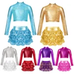 Kids Girls Metallic Sequins Dance Sets Hip Hop Jazz Dance Competition Costume Crop Top with Skirt Stage Performance Dancewear