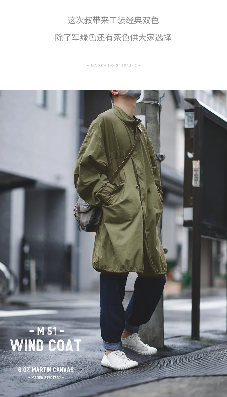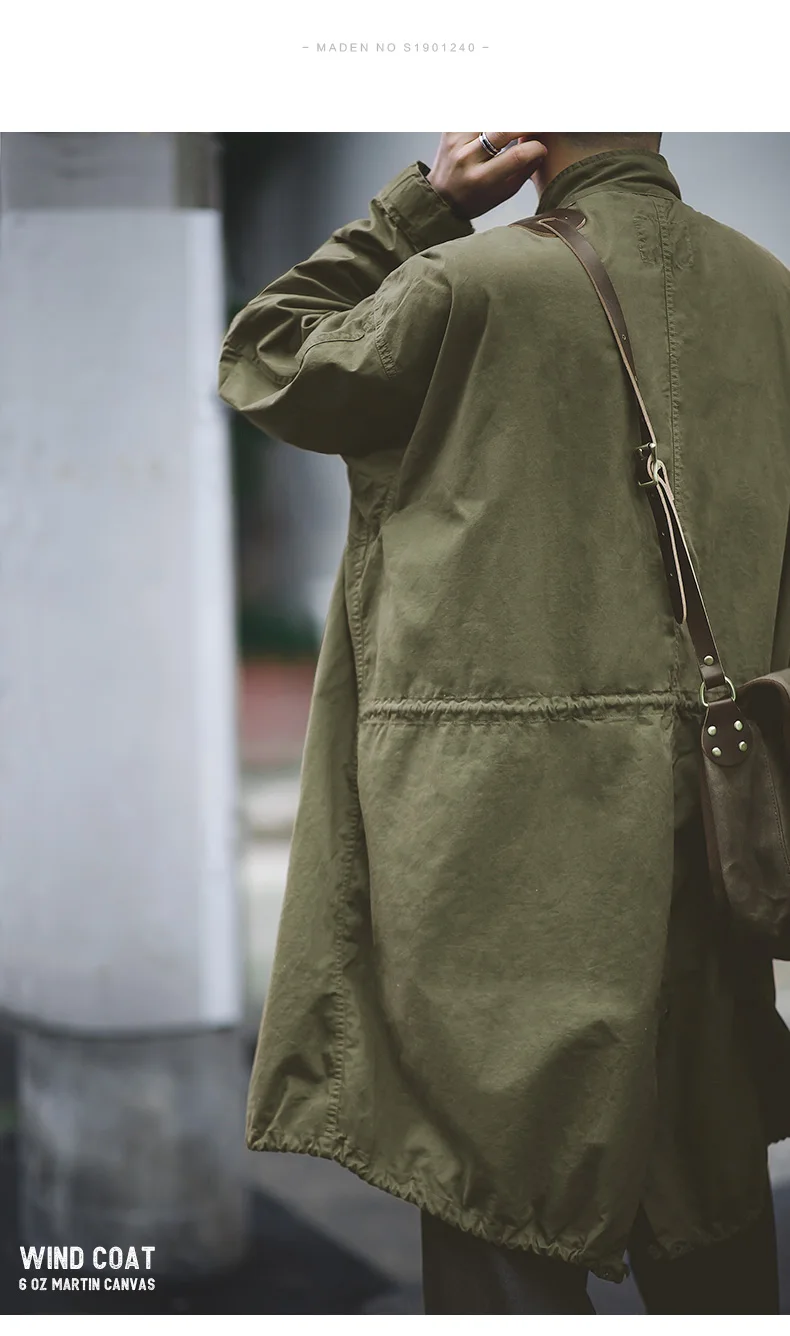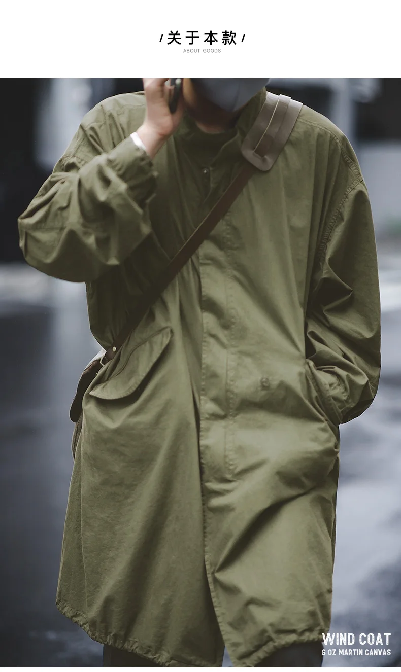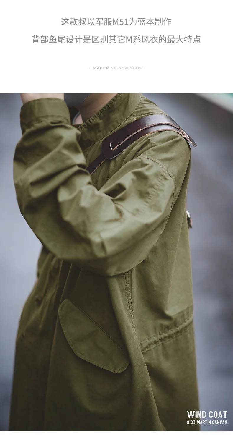 Maden Men’s Vintage M51 Fishtail Green And Camel Trench Coat Woven Waist Rope Mid-length Oversized Loose Coat for Men