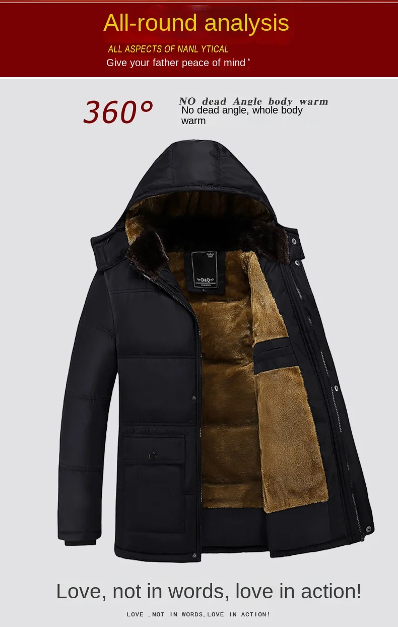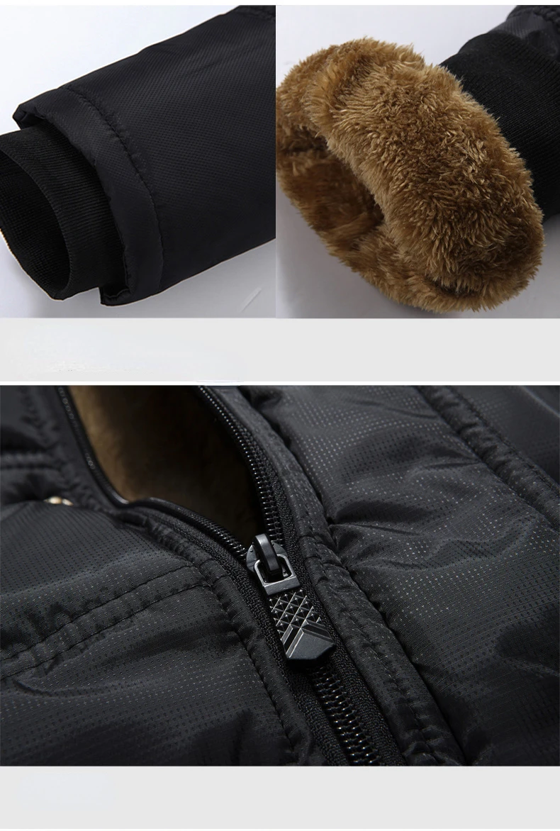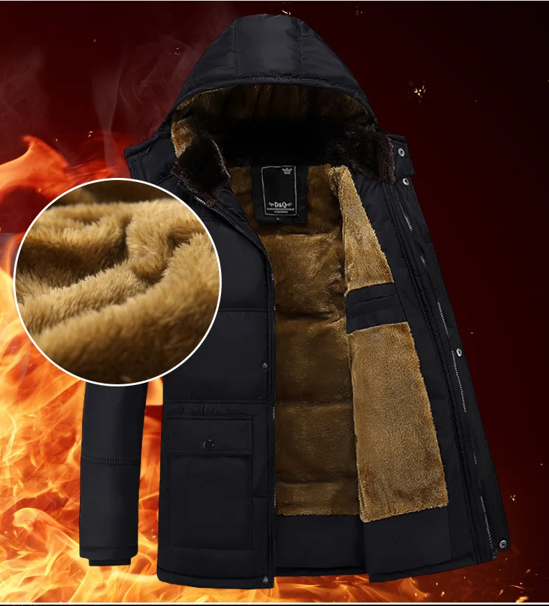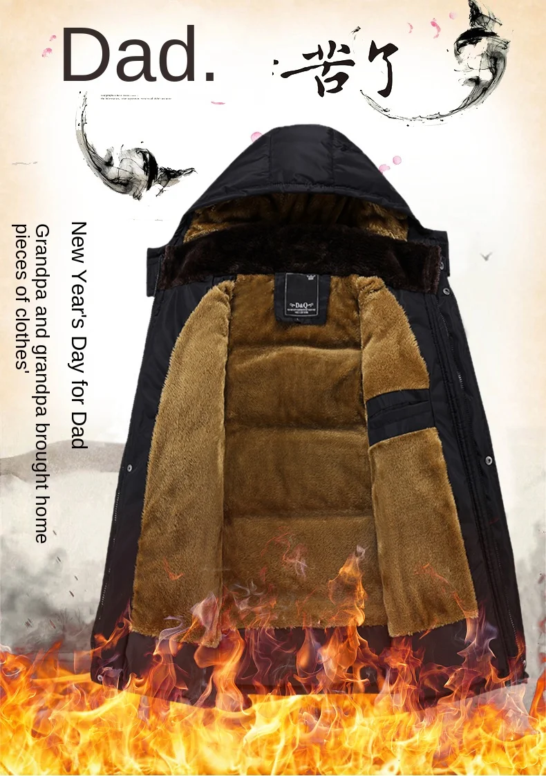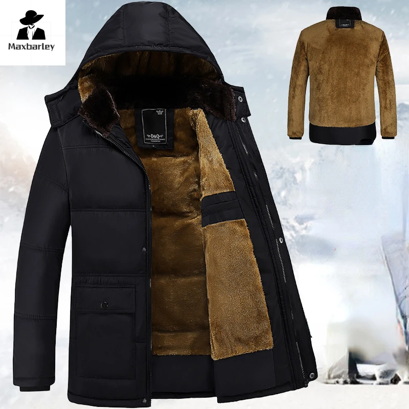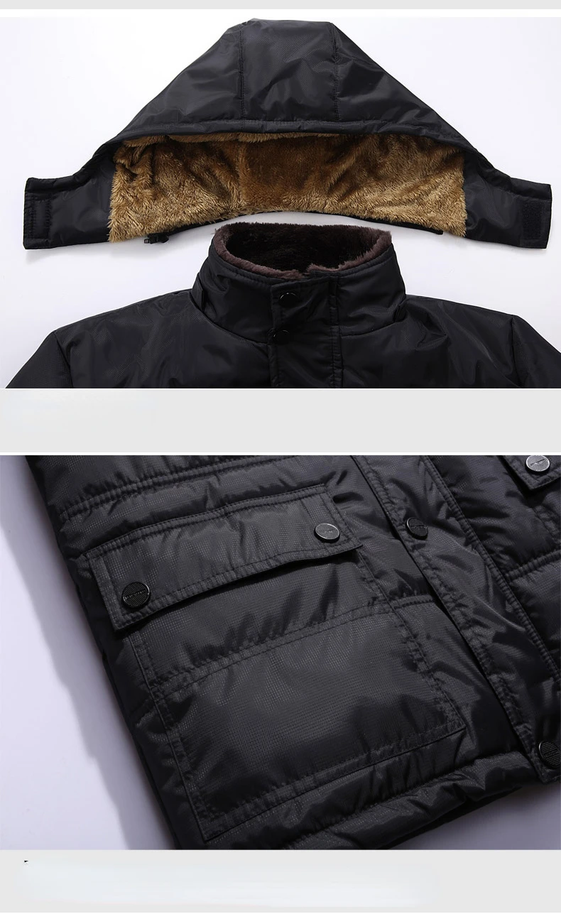 Men’s Winter Jacket Casual Retro Black Multi-Pocket fleece-lined Warm Hooded Parka Men’s Ski Camping Mid-Long Padded Cotton Coat
