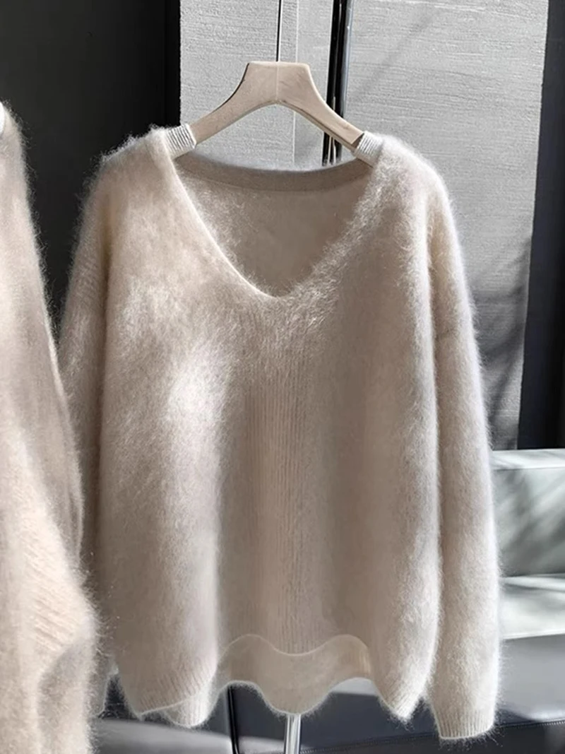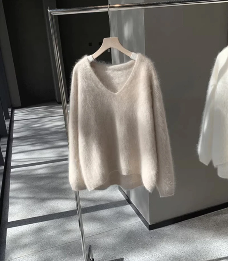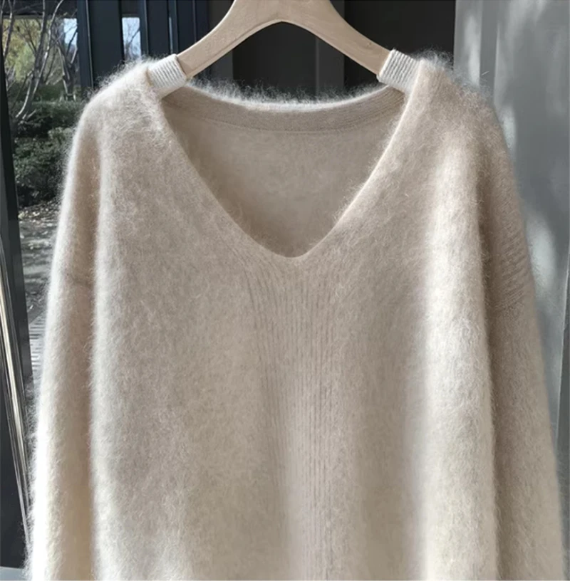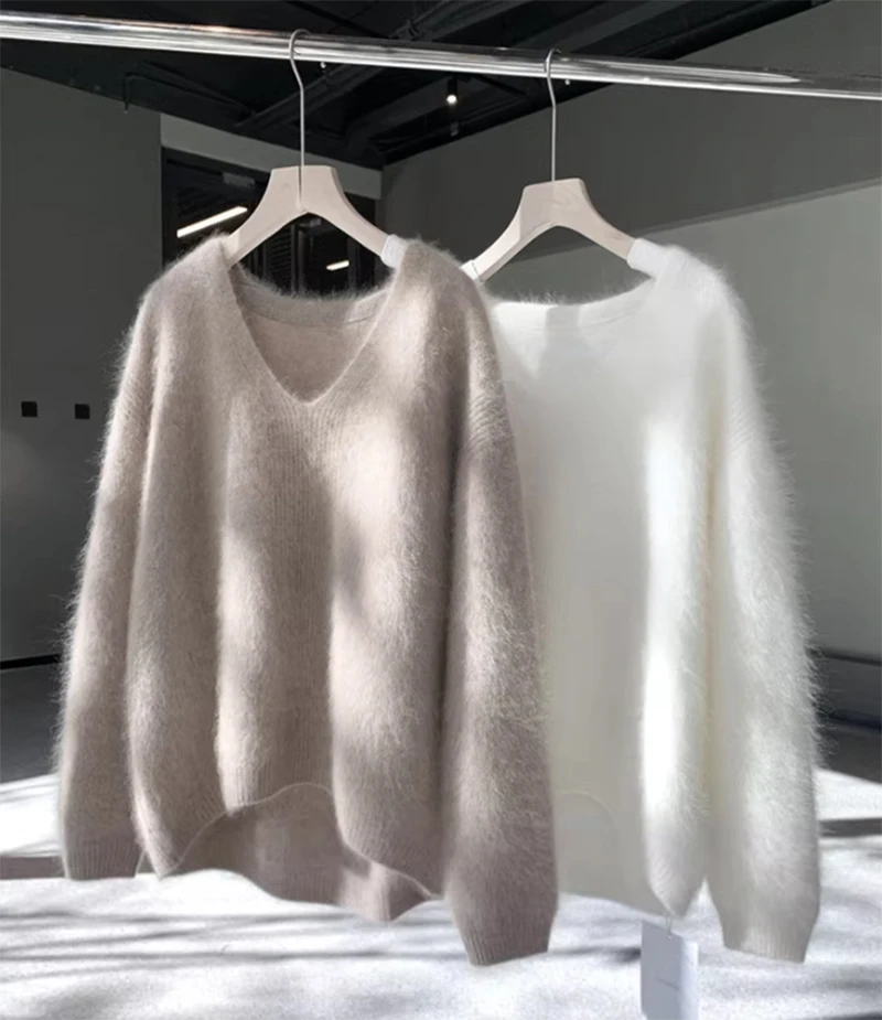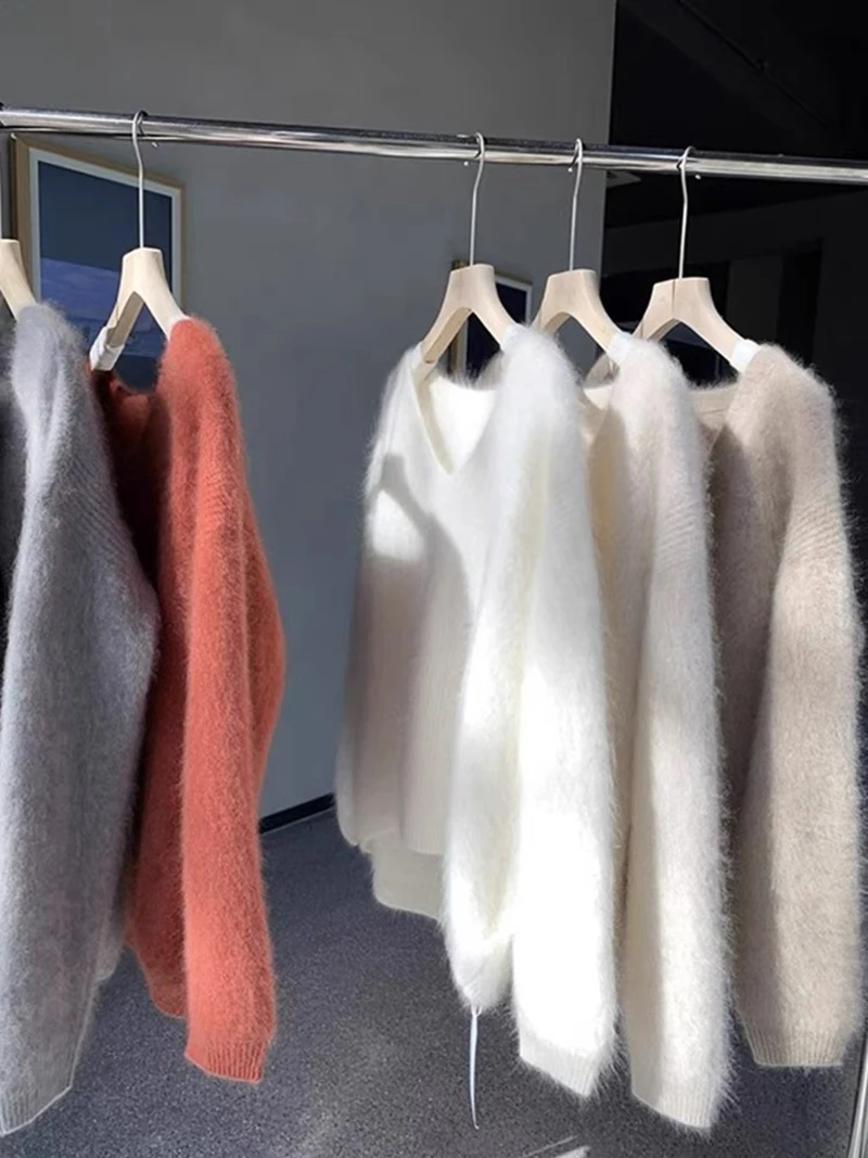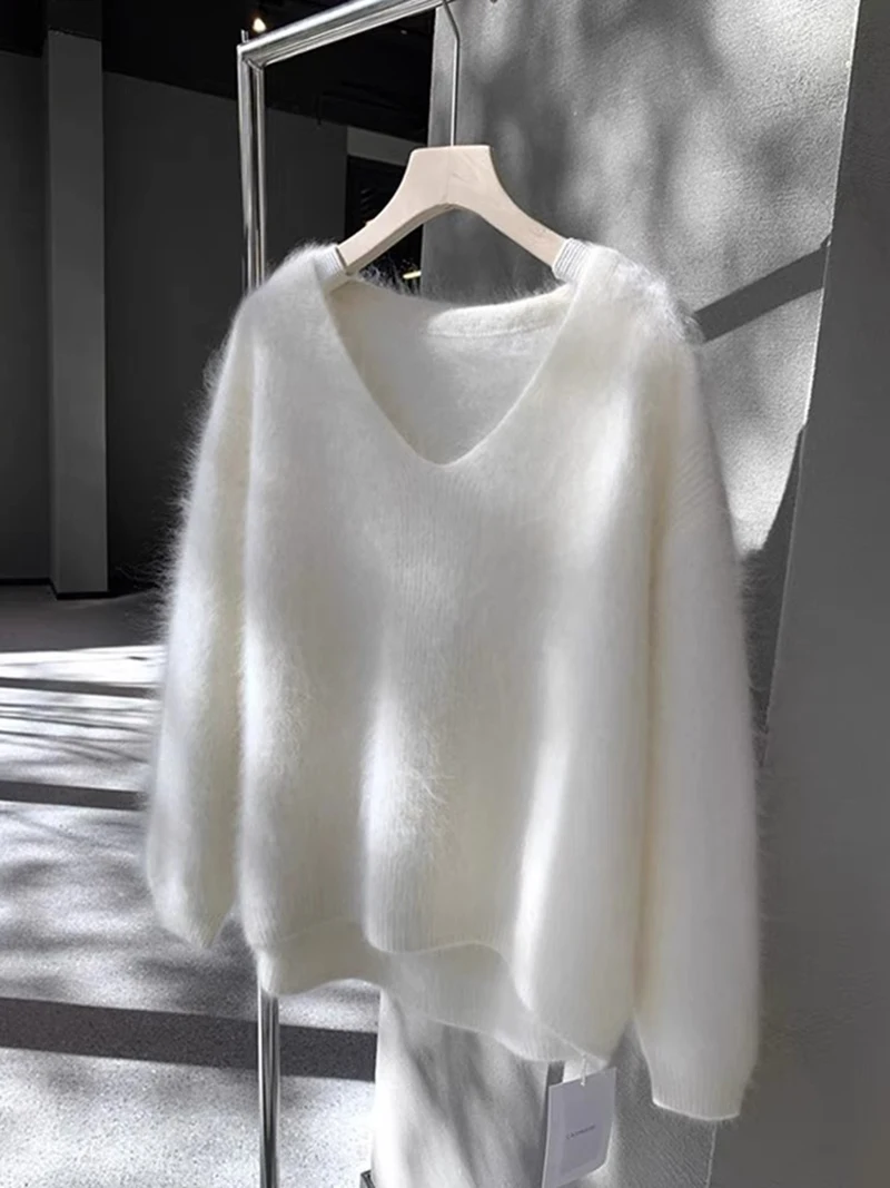 MEXZT Mink Cashmere Sweater Women Fashion V Neck White Knitted Pullovers Korean Long Sleeve Knitwear Fall Winter Loose Jumpers