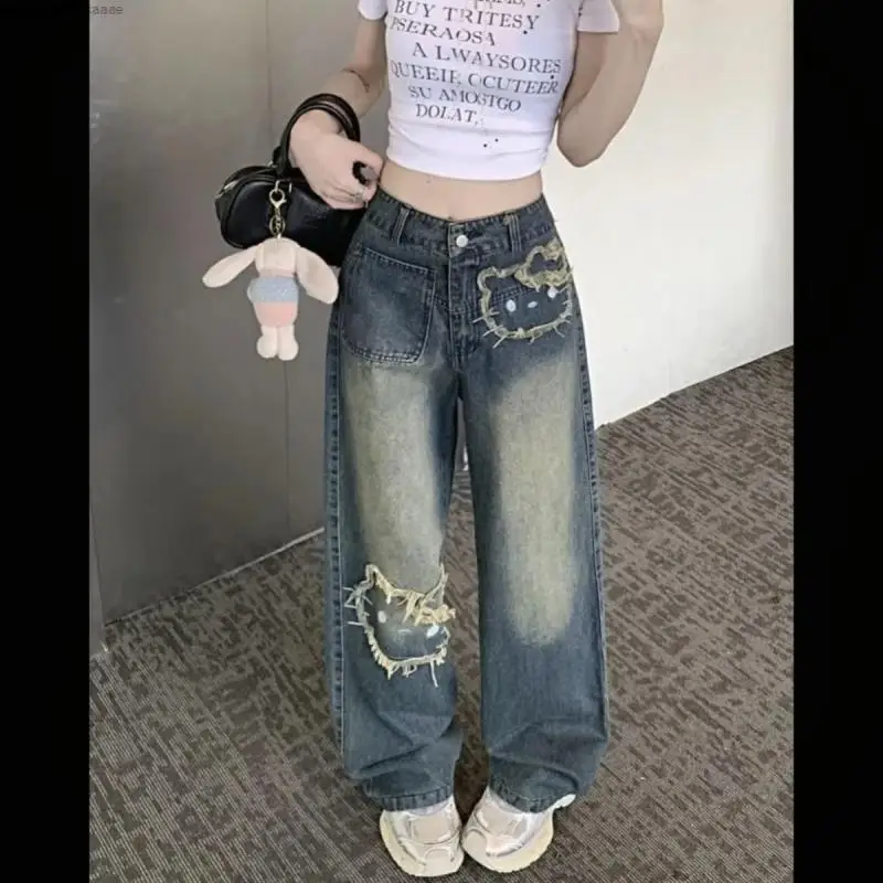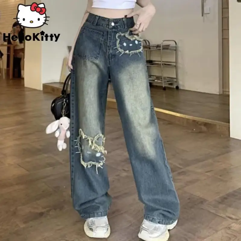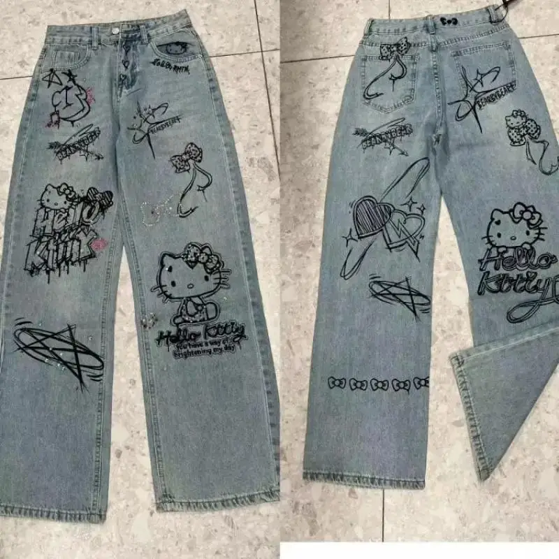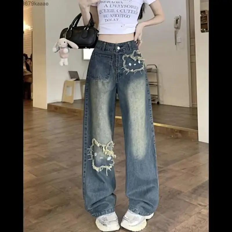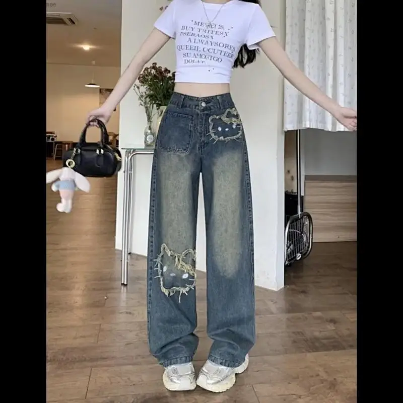 Sanrio Hello Kitty Wide Leg Pants Y2K Korean Version Streetwear Jeans Women Vintage Blue Loose Straight Trousers Cartoon Fashion