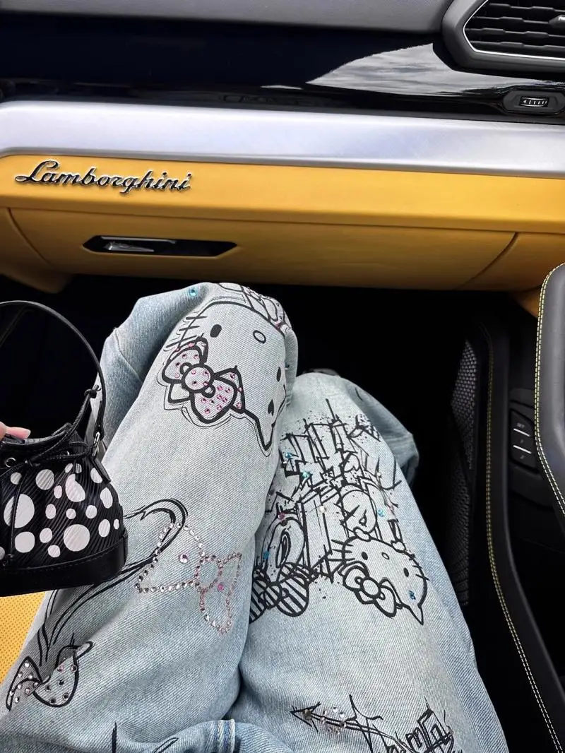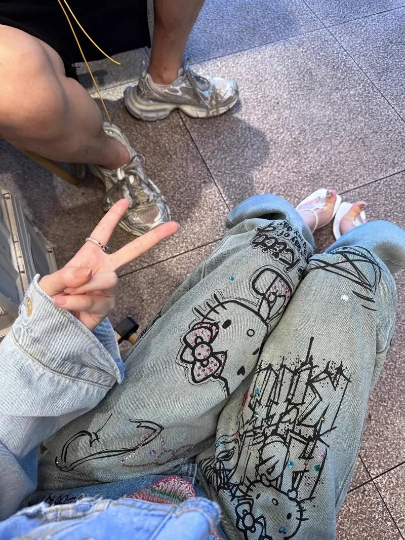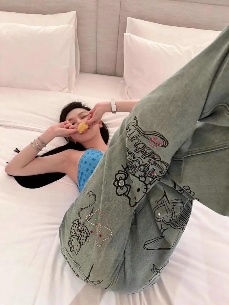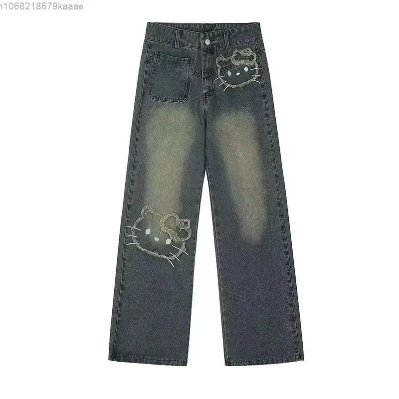 Sanrio Hello Kitty Wide Leg Pants Y2K Korean Version Streetwear Jeans Women Vintage Blue Loose Straight Trousers Cartoon Fashion