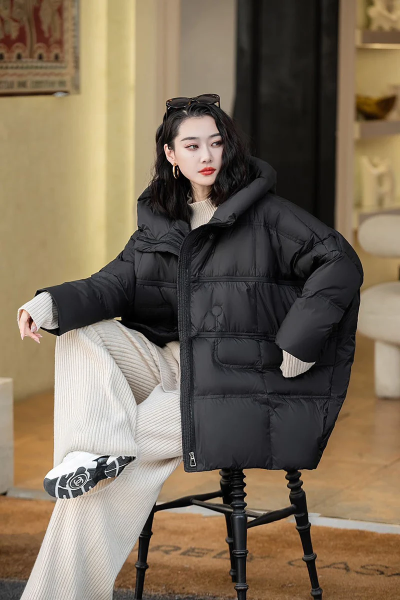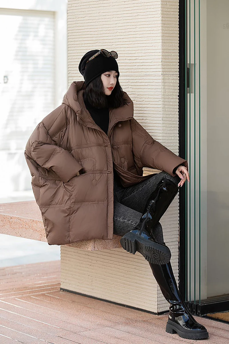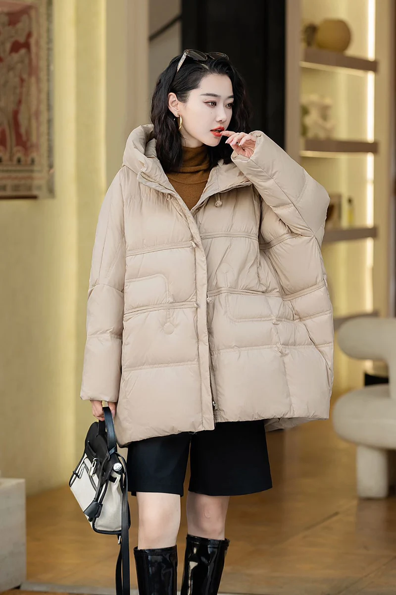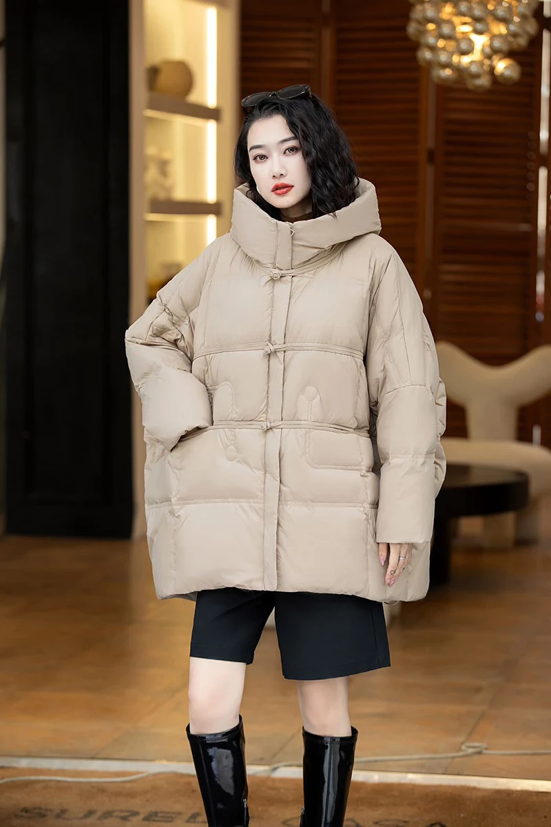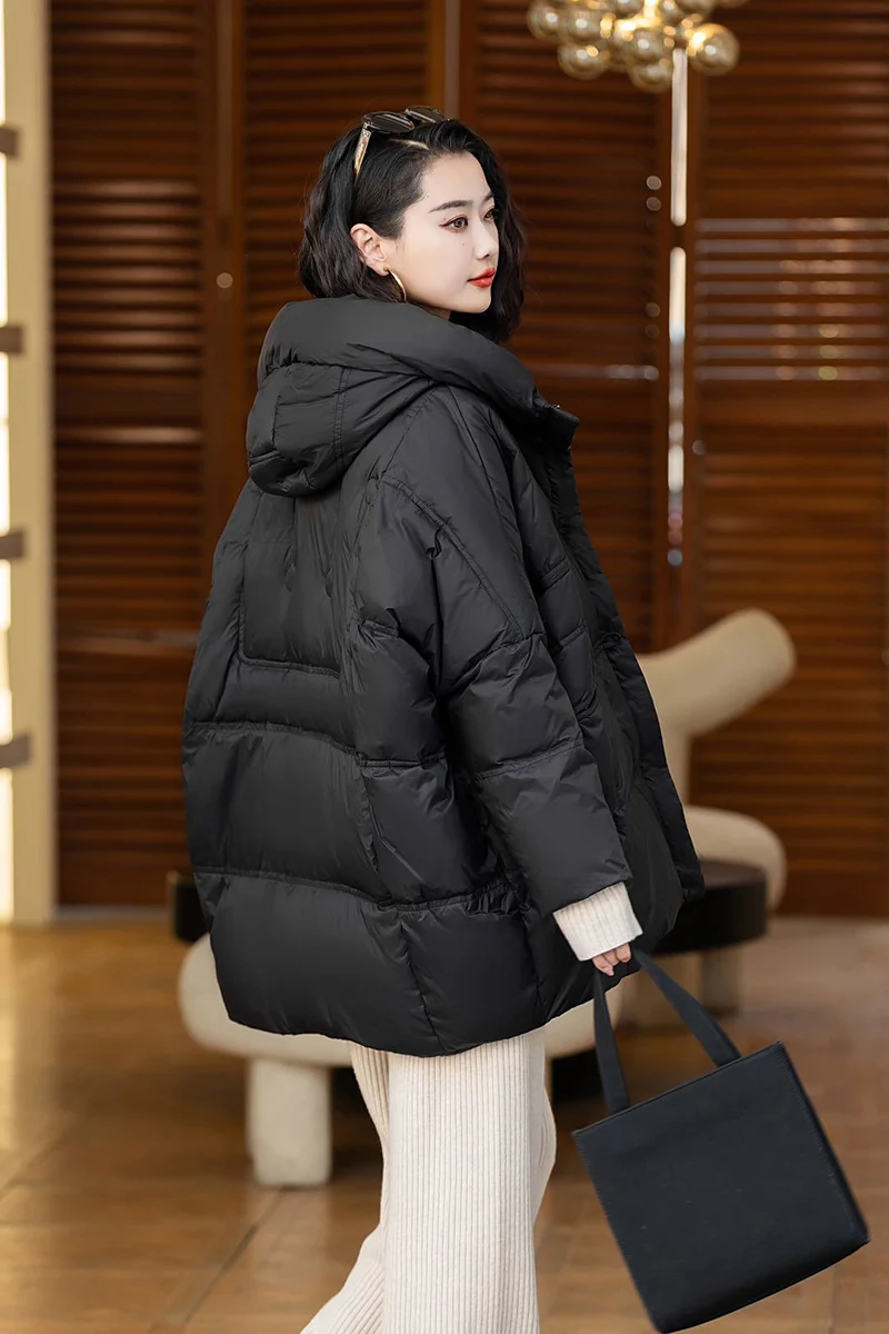 Schinteon Women Down Jacket Casual Over Size Autumn Winter Outwear with Hood Warm White Duck Down Vintage Coat 2024 New