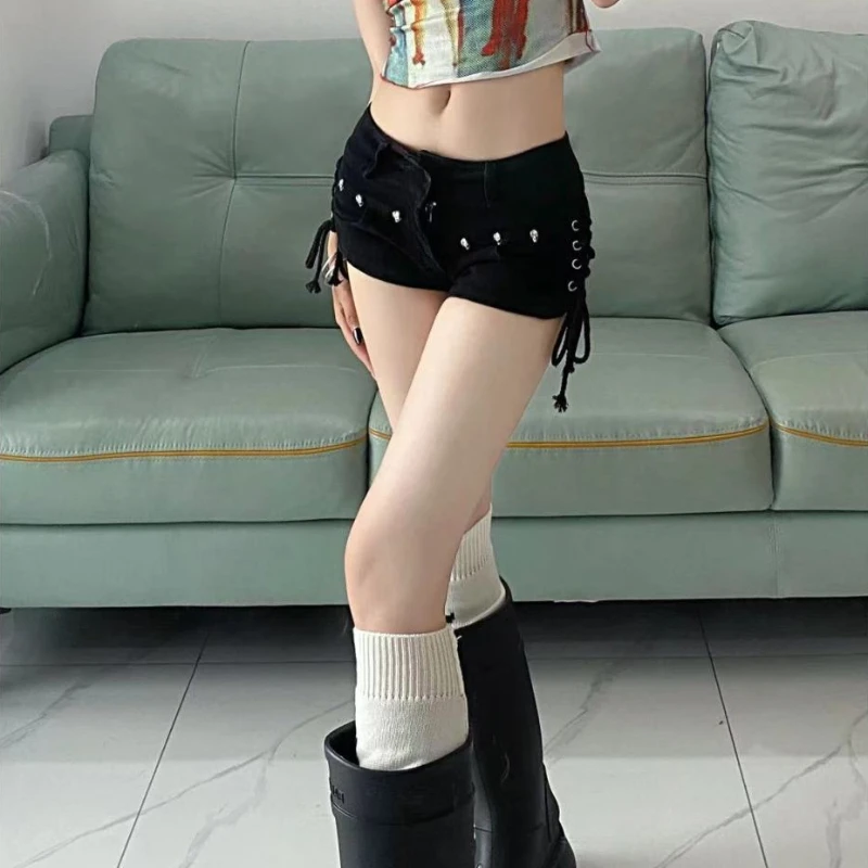 Tight Fit Black Denim Shorts for Women Lace-up Design American Vintage Hot Sexy Girls All-match Trendy Korean Style Summer Ins