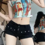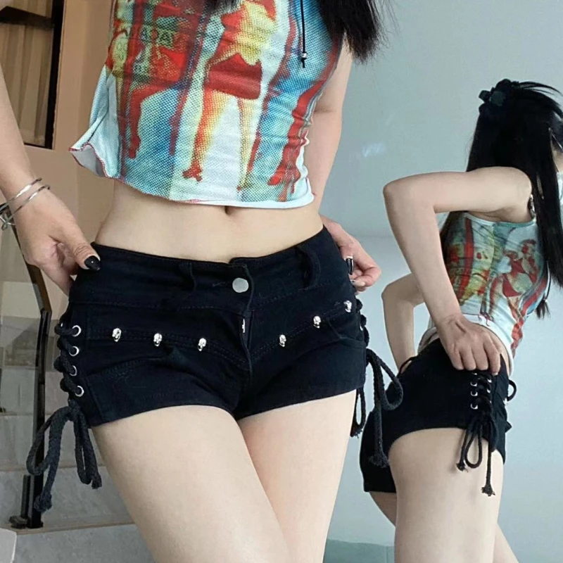 Tight Fit Black Denim Shorts for Women Lace-up Design American Vintage Hot Sexy Girls All-match Trendy Korean Style Summer Ins