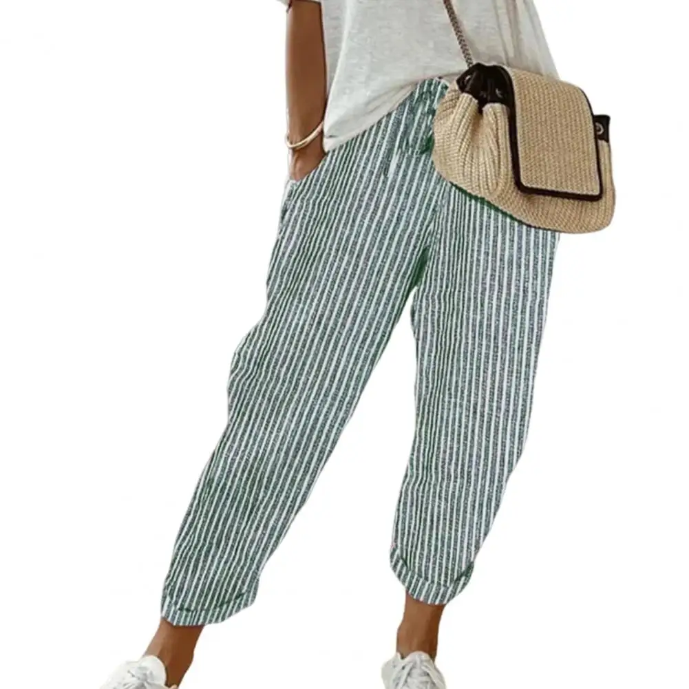 Women Casual Pants Elastic Waist Drawstring Harem Pants with Pockets Vertical Striped Print Beach Office Shopping Daily Long Trousers