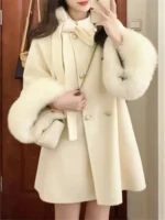 Woolen coat for women 2023 new bow tie cape fur splicing Quilted overcoat autumn winter Female outerwear Y4810
